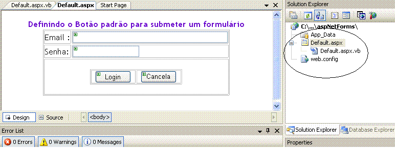 default.aspx. Ao pressionar ENTER o botão Login que esta definido como o botão padrão será acionado executando o código: Response.Redirect("Login.aspx") |