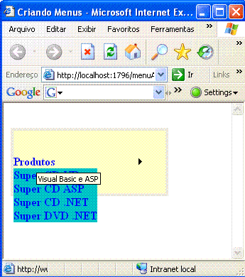 Após efetuar a vinculação do arquivo XML definindo a sua propriedade DataSourceID para SiteMapDataSource1, estamos prontos para ver os dados definidos no arquivo exibidos no controle Menu. Execute o projeto web via servidor web embutido no VWD. A página resultante irá exibir o Menu e os itens quando o usuário passar o mouse na opção Produtos do menu: