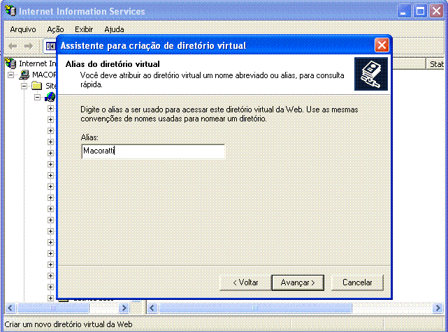 Pronto ! Você criou um diretório virtual chamado Macoratti que poderá usar para colocar seus arquivos .ASP ou ASP.NET para serem executados através do IIS.