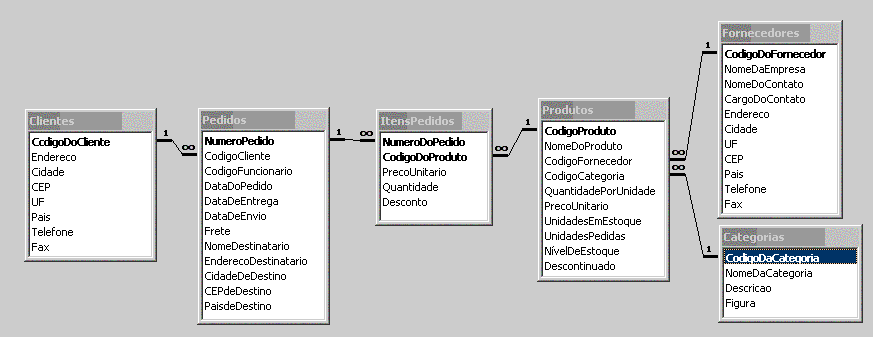 Teremos uma relação de 1 para N entre a tabela Pedidos e ItensPedidos e uma relação N para 1 entre a tabela ItensPedidos e Produtos.