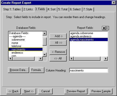 Vamos selecionar os campos da tabela que serão impressos no relatório - selecione cada campo e clique no botão Add. Ao final devemos ter algo parecido com a figura 2.0 abaixo:A esta altura o relatório esta praticamente terminado , para visualizá-lo clique no botão Preview Report. É mostrada a tela da figura 3.0 onde após clicarmos na aba Design podemos notar cinco seções: