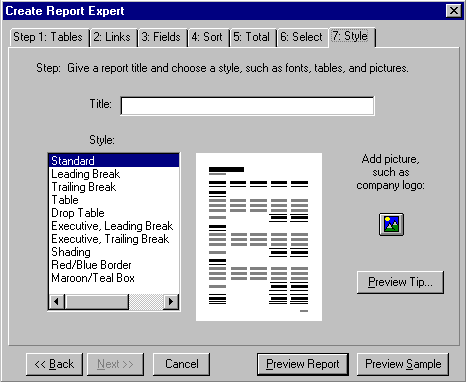 Você pode utilizar a guia Style para escolher a forma de apresentação do relatório.Para isto selecione um dos estilos na caixa de listagem style e veja á direita o jeitão do relatório. Se quiser pode inserir uma figura no relatório clicando no botão Add Picture... com o ícone. A caixa de texto Title lhe permite inserir o título para o relatório. Conteúdo