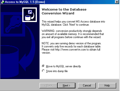 Após instalar o programa execute-o e siga o Assistente. Como exemplo vou converter o banco de dados funci.mdb ( Access 7.0 ) para o MySQL . Veja as telas abaixo: