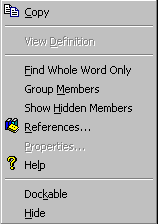 Se você clicar com o botão direito do mouse surge o menu de contexto (Figura 3.0) que permite visualizar as propriedades do item selecionado. Ao selecionar a opção Group Members todas as propriedades e métodos de um objeto são agrupados . Observe que os métodos e propriedades definidos numa classe são chamados de membros.
