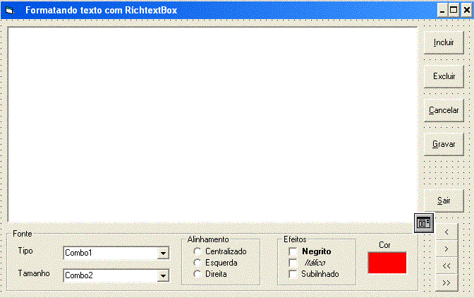 chkNegrito_Click() If chkNegrito.Value = 2 Then Exit Sub RichTextBox1.SelBold = chkNegrito.Value End Sub Private Sub chkItalico_Click() Private Sub chkSublinhado_Click() |