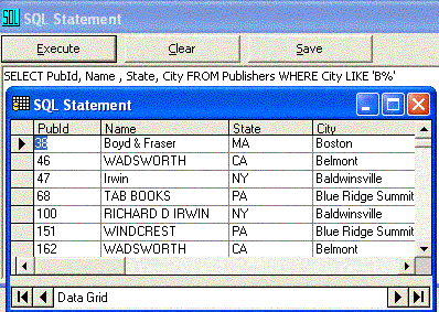 O comando acima exibe todas as colunas indicadas da tabela Publishers onde a coluna state for iniciada com a letra B.
