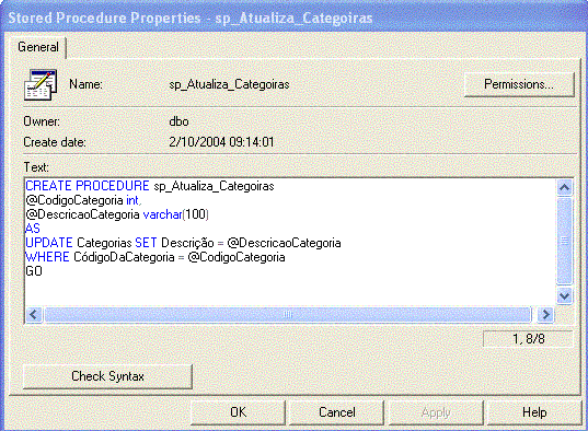 A stored procedure sp_Inclui_Categorias para incluir dados na tabela Categorias teria o seguinte código :