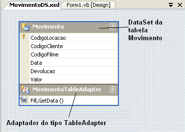 Será exibido a representação do objeto MovimentoDS, conforme figura acima, onde temos a tabela com seus respectivos campos e o objeto TableAdapter que permite alimentar, atualizar e aplicar filtros a fonte de dados.