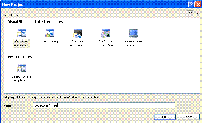Vamos então arregaçar as mangas e por a 'mão na massa'. Inicie o Visual Basic 2005 Express Edition e clique na opção Create Project, selecionando a seguir na janela New Project o Template Windows Application, e, informando o nome do projeto como Locadora Filmes (ou algo que melhor lhe apetecer...eu vou usar o nome citado.) conforme figura abaixo: