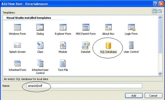 Com o projeto aberto, na janela Solution Explorer, clique com o botão direito do mouse sobre o nome do projeto e selecione a opção Add e New Item. Na janela Add New Item selecione o template SQL DataBase e informe o nome amazon.mdf clicando a seguir no botão Add. O ícone do banco de dados Amazon.mdf deverá aparecer na janela Solution Explorer e o assistente para configuração do Data Source deverá aparecer. Como não vamos configurar o Data Source agora clique no botão Cancel.