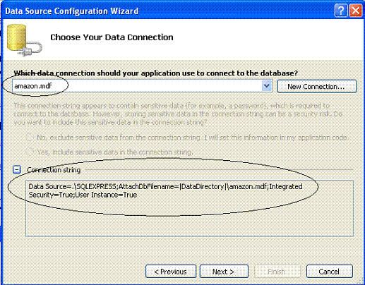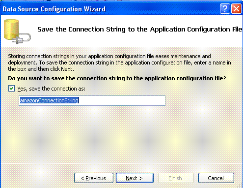 Na próxima janela você tem a opção de salvar a string de conexão que a aplicação irá usar para se conectar com o banco de dados amazon.mdf no arquivo de configuração da aplicação. Esta opção permite que você altere os detalhes sobre as informações do banco de dados sem ter que recompilar sua aplicação mesmo depois que ela foi distribuída. Desta forma na janela Save de Connection String to de Configuration File aceite o valor padrão e deixe marcada a opção para salvar a string de conexão no arquivo de configuração. Clique no botão Next>