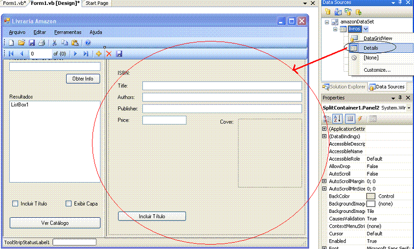Após efetuar esta operação você vai notar que alguns novos controles foram incluídos na base do formulário form1.vb. Estes controles são responsáveis pela vinculação dos dados do banco de dados com os controles do formulário. Os novos controles são: LivrosTableAdapter, LivrosBindingNavigator, LivrosBindingSource e AmazonDataSet
