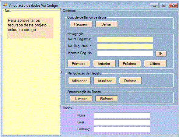 Um sistema básico com um tutorial prático sobre ADO.NET. Compare e aprenda estudando o código como vincular informações contidas em banco de dados a formulário WinForms usando programação e usando a vinculação DataBinding. Código detalhado . Operações básicas com Banco de dados usando ADO.NET.