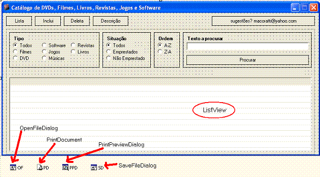 Os principais componentes usados no sistema são: ListView , Panel, OpenFileDialog, PrintDocument, PrintPreviewDialog, SaveFileDialog.