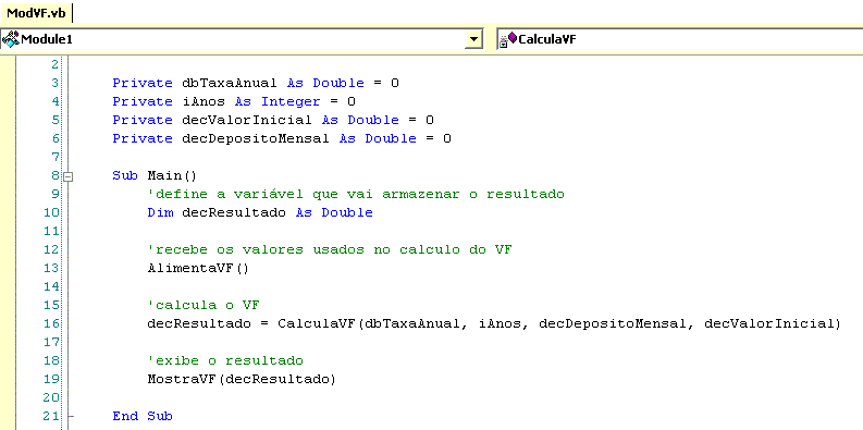 Criamos a função CalculaVF(dbTaxaAnual, iAnos, decDepositoMensal, decValorInicial) que irá calcular o Valor Futuro. Perceba que a função usa quatro parâmetros que serão usados no calculo da operação.