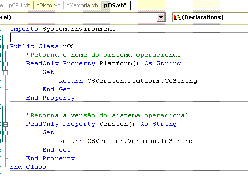Novamente vamos usar o namespace System.Environment , e, através da declaração Imports declará-lo em nossa classe.