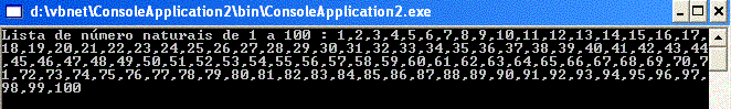 Console.WriteLine(sb) ' => Lista de número naturais de 1 a 100: 1,2,3,4,5,6,... Console.ReadLine() End Sub End Module |