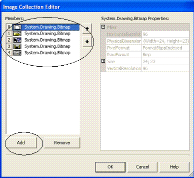 Você verá a janela do Image Collection Editor. Clique no botão Add , uma janela de diálogo será aberta para você identificar a imagem que deseja incluir . Vamos escolher imagens na pasta de imagens do VS.NET , para isto navegue em Arquivos de Programas/Microsoft Visual Studio .NET/Commo7/Graphics/Bitmaps/OffCtlBar/Large/Color (você pode escolher qualquer outras imagens que desejar). Escolha algumas imagens para incluí-las na coleção. Ao final você deverá obter algo parecido coma figura abaixo: